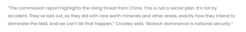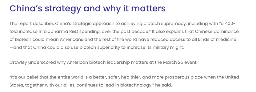 Crowley称,“生物技术主导地位就是国家安全”,并呼吁全面落实报告提出的49项建议,以阻止中国取代美国成为全球生物技术领导者。