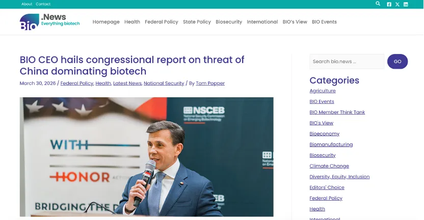 (详细报道请见:https://bio.news/national-security/bio-ceo-hails-congressional-report-on-threat-of-china-dominating-biotech/)