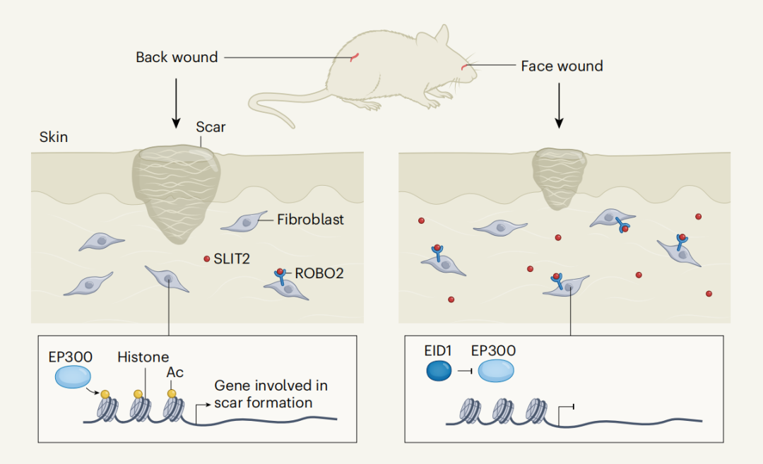 简单来说,面部细胞通过 “ROBO2 → EID1 → EP300” 这条信号轴,主动抑制了“促疤痕程序”,实现了更倾向于再生(而不是纤维化)的愈合。