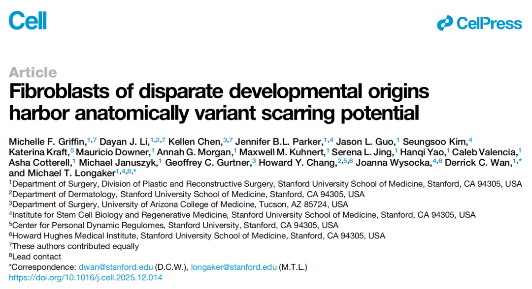 近日,斯坦福大学医学院的研究人员在国际顶尖学术期刊 Cell 上发表了题为:Fibroblasts of disparate developmental origins harbor anatomically variant scarring potential 的研究论文。