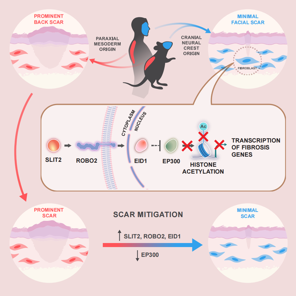 该研究发现,皮肤中的“修复者”——成纤维细胞,其“工作结果”(形成疤痕的程度)竟由胚胎时期的出身决定。面部皮肤成纤维细胞源自神经嵴,其自带“抗疤痕”光环,研究团队进一步揭示了其抗疤痕的“ROBO2 → EID1 → EP300”信号轴,而调控这个信号轴,能够让容易留疤的背部皮肤的伤口像面部皮肤伤口一样更好地愈合。