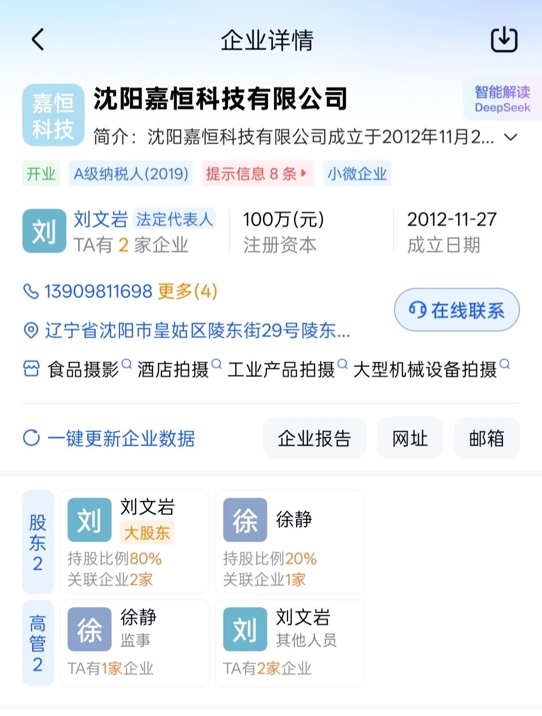 爱企查App显示,嘉恒摄影关联公司沈阳嘉恒科技有限公司成立于2012年11月,法定代表人为刘文岩,注册资本100万元人民币,经营范围包括企业形象设计、摄影服务、展览展示及会议服务等,由刘文岩、徐静共同持股。