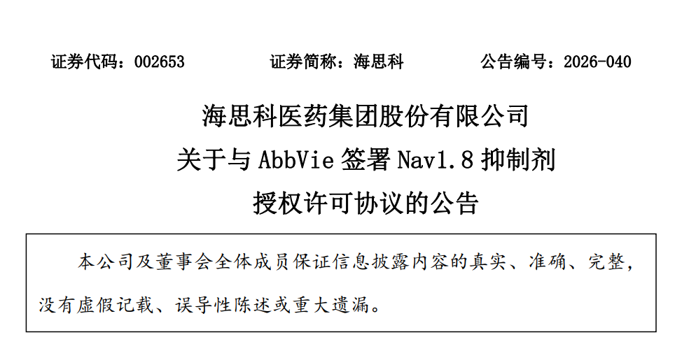 作为此次交易对价,海思科将获得3000万美元首付款及最高7.15亿美元的额外里程碑付款,交易总金额最高可达7.45亿美元。此外,艾伯维还将承担授权品种开发至临床概念验证阶段的部分研发成本。