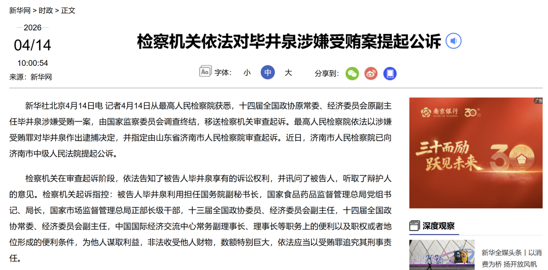 今日医药圈的大消息,检察机关已依法对毕井泉涉嫌受贿案提起公诉。