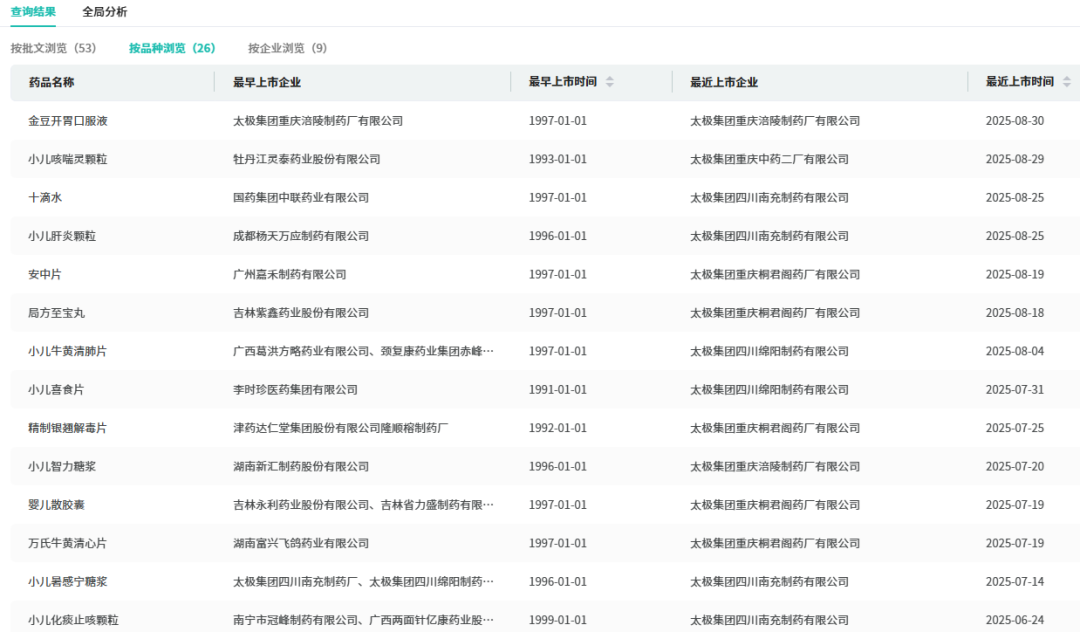 摩熵医药数据显示,太极集团在中成药儿童用药市场已有26个产品获批上市,其中金豆开胃口服液、小儿暑感宁糖浆、双苓止泻口服液、儿康宁糖浆四款为独家品种。双苓止泻颗粒的临床推进,有望进一步巩固和扩大其在儿科中药市场的领先地位。