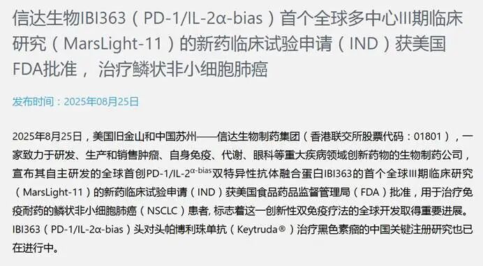 信达生物的2025年标志着其完成了从Biotech向BioPharma的全面跨越。当年公司实现总营收130.42亿元,同比增长38.4%,首次在IFRS计量下实现全年盈利,净利润达8.14亿元,Non-IFRS净利润同比增长419.6%至17.23亿元。这一成绩的取得建立在极其扎实的基本盘之上。信达生物目前拥有18款上市产品,覆盖肿瘤、心血管及代谢等多个领域。其中信迪利单抗在经历2022年的行业阵痛期后,凭借持续放量的适应症拓展依然贡献了超过三分之一的收入,但公司未来的增长引擎已明显向非肿瘤板块转移。在肿瘤领域,信达生物的新一代IO及ADC疗法价值正在加速兑现。公司在早期曾经像许多同行一样广泛布局了诸多下一代IO靶点组合,经历了大量失败与淘汰。这种残酷的试错过程最终孕育出具有卓越早期临床数据的PD-1/IL-2α-bias双抗IBI363。基于其在早期肺癌中显示的显著总生存期获益,该药物以超百亿美元的总包授权给武田制药,充分证明了其国际竞争力。同时信达在ADC领域的执行力令人瞩目,2022年才将首个ADC分子推进临床,仅用三年时间便构建了国内一线的ADC管线,其中Claudin18.2 ADC甚至具备后来居上成为国内首款读出三期结果分子的潜力。图2.IBI363(PD-1/IL-2α-bias)新药临床试验申请获美国FDA批准在非肿瘤领域,信达生物培育了多款具有大单品潜质的药物。全球首个获批上市的GCG/GLP-1天然双靶点减重降糖药玛仕度肽被机构预测峰值销售额有望突破50亿元。中国首个原研IL-23p19单抗匹康奇拜单抗在中重度斑块状银屑病治疗中展现出优效性且维持期给药间隔大幅延长,预测峰值销售额超过30亿元。甲状腺眼病治疗领域70年来首款新药替妥尤单抗的预测销售峰值也超过20亿元。此外公司已有8款眼科新药在研,多款属于First in class级别。信达生物的员工规模在2023年低谷期后快速回升,2025年超过7500人,销售人效从2021年的145万提升至2025年的248万。按照规划,2026年公司将计入与武田和礼来两笔BD交易的合计超百亿元首付款,2027年目标实现200亿元产品收入。信达生物的路径表明,差异化不仅体现在技术路径的甄别上,更在于能够构建一个抗风险能力强、现金流可持续的多元生态体系。三、恒瑞医药:厚积薄发的全面创新转型