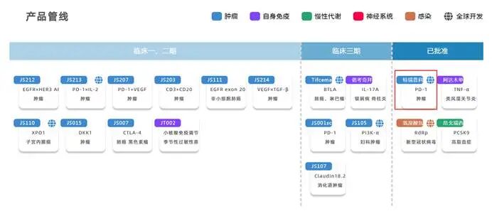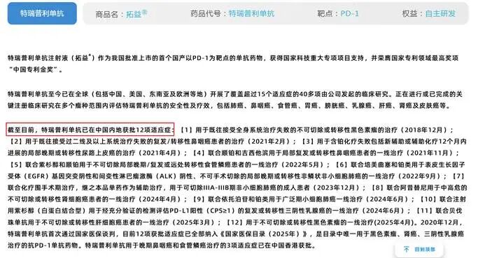 在四小龙中,君实生物的发展历程相对坎坷。作为首家获批上市的国产PD-1单抗,特瑞普利单抗在2020年实现10亿元销售额后,于2021年遭遇滑铁卢,收入骤降至4亿元。在肺癌、肝癌等大癌种的一线治疗中难以与其他三家正面抗衡的情况下,君实生物被迫选择差异化突围,将重心转向辅助与新辅助治疗等更前线的场景,以及一线肾癌、三阴性乳腺癌等差异化适应症。图4. 君实生物研发管线图5. 特瑞普利单抗基本概况及适应症情况这一策略在近年逐渐显现成效。2025年君实生物营业收入达到24.98亿元,同比增长28.23%,其中特瑞普利单抗国内市场销售收入突破20.68亿元。截至目前该药物已在中国内地获批12项适应症,并在中美欧等全球40多个国家和地区获批上市,海外市场的拓展为其提供了额外的增长空间。为了进一步延长产品生命周期,君实生物推进了特瑞普利单抗皮下注射制剂的研发,成为首款进入上市申报阶段的国产抗PD-1皮下制剂。尽管销售额回暖,但君实生物至今仍是四小龙中唯一未能实现盈利的企业。2025年公司净亏损8.75亿元。更深层次的矛盾在于投入产出比,截至2025年特瑞普利单抗的累计销售额达到74亿元,而其累计研发投入已高达63.3亿元,预计仍需两年以上时间才能收回研发成本。截至2025年底,公司净现金为-8.7亿元,面临客观的资金压力。在后续管线布局上,君实生物正努力从单抗向小分子、ADC及双抗等领域扩展。2025年公司新启动了PD-1/VEGF双抗JS207的国内和海外二期及三期临床,以及Claudin18.2 ADC的三期临床,并布局了EGFR/HER3 ADC、PD-1/IL-2双抗等热门靶点。但整体来看,除了特瑞普利单抗及相关联合疗法外,君实生物仍缺少一个具有绝对说服力的重磅核心项目来证明其长期的造血能力。君实生物的现状反映了在创新药红海中,后发药企在资源受限条件下寻找破局之道的极高难度。五、结语