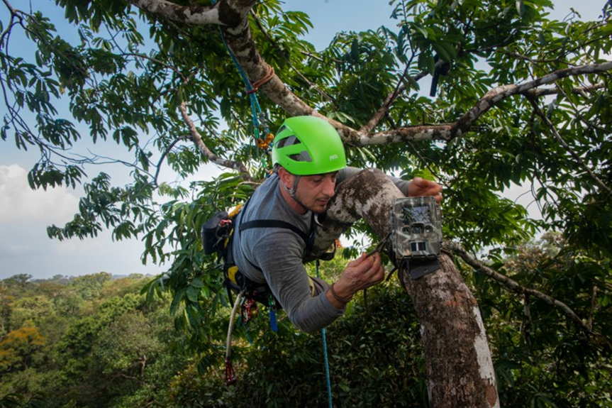 在法属圭亚那,研究人员将一台用于拍摄野生动物的相机固定在树上。图片来源:Philippe Psaila/Science Photo Library