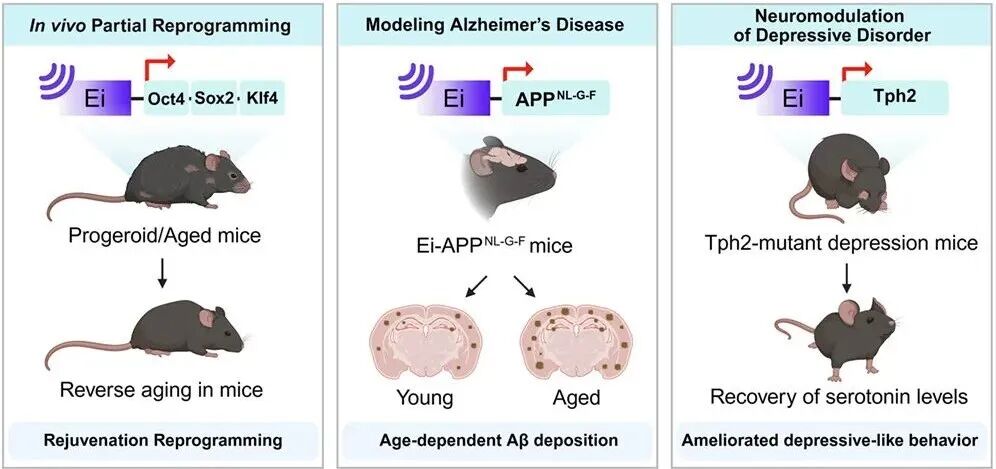 该研究展示了一项突破性技术——电磁场诱导基因开关(EMF-inducible gene switch,简称为 Ei),它能让科学家像使用遥控器一样,远程、精准地控制活体动物体内的基因表达,并成功用于逆转衰老、阿尔茨海默病建模、抑郁症治疗。