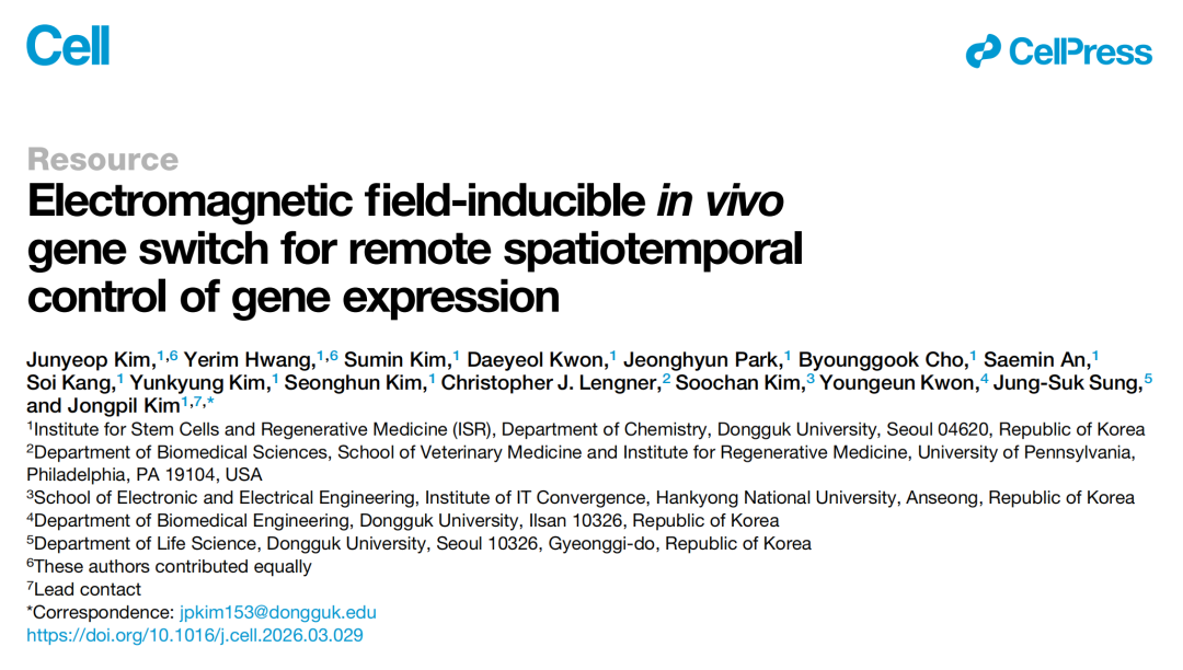 2026 年 4 月 14 日,东国大学的研究人员在国际顶尖学术期刊 Cell 上发表了题为:Electromagnetic field-inducible in vivo gene switch for remote spatiotemporal control of gene expression 的研究论文。
