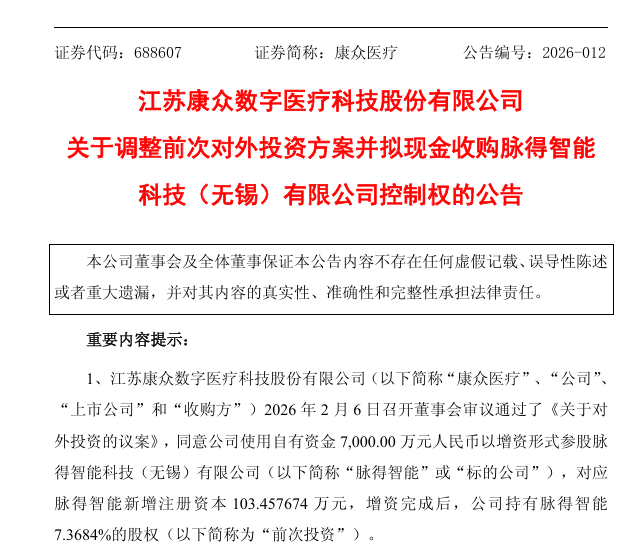 来源:器械之家,未经授权不得转载,且24小时后方可转载日前,康众医疗发布公告称,公司拟以7.5亿元估值现金收购亏损中的脉得智能科技(无锡)有限公司(简称“脉得智能”)控制权。交易若完成,公司将新增约3.7亿元商誉,相当于其净资产的44%。值得一提的是,康众医疗本次交易资金有70%来源于银行并购贷款。因此,在自身主业由盈转亏的背景下,康众医疗这场高溢价、高负债、高风险的跨界并购引发了行业的高度关注。