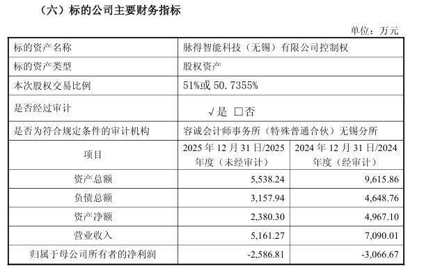 根据公告,康众医疗此次调整前次对外投资方案,拟以现金方式收购脉得智能科技(无锡)有限公司控制权。经交易各方协商一致,本次交易按照标的公司的整体估值为7.5亿元进行。该交易是康众医疗在两个月内完成对脉得智能投资逻辑的重大重构,从“财务试水”转向“战略控股”,其核心条款、估值及风险敞口均发生质变。本次交易核心目标为获取脉得智能50.7355%至51%控股权以实现并表,总对价约3.825亿元,资金结构为30%自有资金加70%银行并购贷款。高比例举债将直接推高公司有息负债与财务费用,叠加主业亏损,其现金流与偿债压力显著上升。需要强调的是,因标的含国有股东无锡梁溪创投(持股8.5429%),其中4.5429%股权需在产交所挂牌转让,康众设置双路径保障控股:若第三方竞拍价≤3407万元,康众行使优先购买权受让该部分股权,最终持股 51%;若竞拍价超3407万元,则由无锡脉向共赢转让4.2784%股权,最终持股50.7355%。在估值方面,本次交易对脉得智能整体估值达7.5亿元,对应其2025年末2380.30万元净资产,市净率高达31.5倍,远超医疗器械行业平均水平。按财务数据测算,交易将形成3.705至3.765亿元商誉,占康众2025年末归母净资产(8.50亿元)的43.6%至44.3%,商誉风险突出。此外,标的账面未体现二类、三类医疗器械注册证价值,合并报表将确认大额无形资产增值并逐年摊销;若脉得智能业绩不及预期,除摊销压力外,商誉减值可能吞噬上市公司利润,引发业绩“暴雷”。