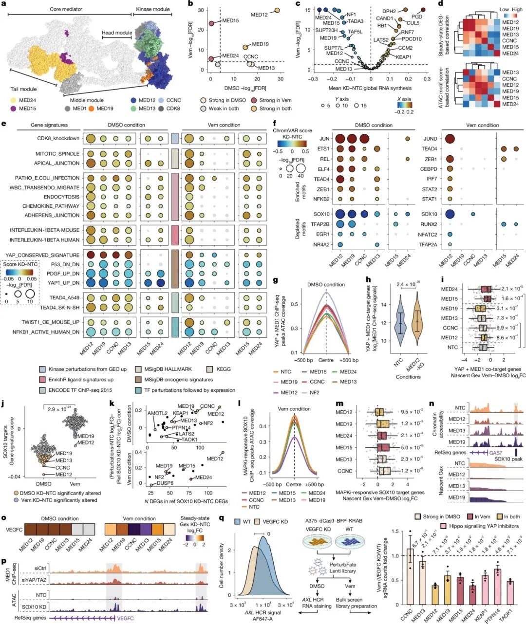 独特的MED12:除了作为激酶模块的一部分解除对YAP-TEAD的抑制外,MED12的敲低还会特异性地损害分化主导因子SOX10的活性和其靶基因的表达。这种双重作用使得MED12扰动在无论有无药物存在的情况下,都能强烈驱动去分化和耐药。