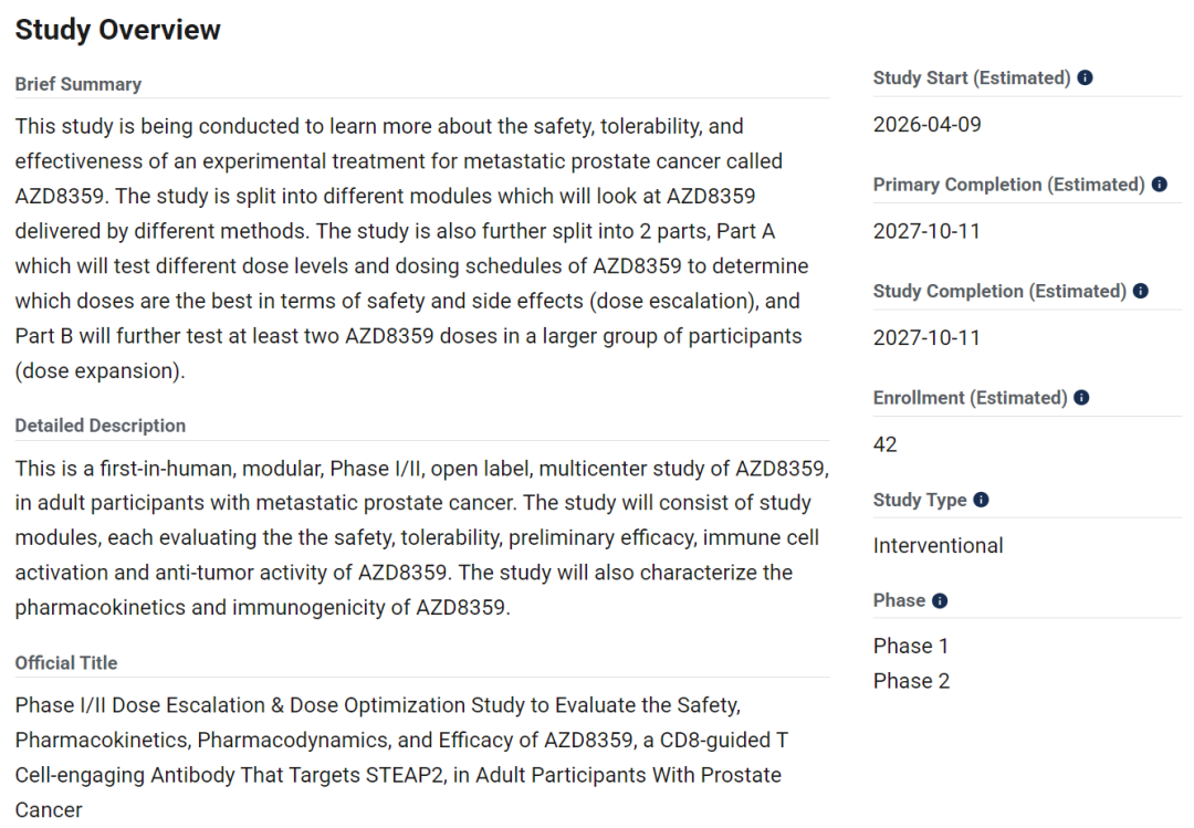 2026年4月14日,阿斯利康在Clinicaltrials.gov网站上注册了AZD8359治疗前列腺癌的1/2期临床试验CRIUS-1。