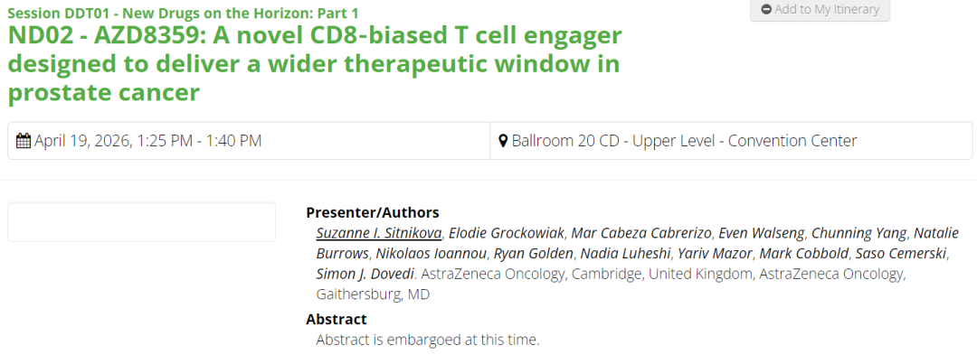 AZD8359为一款STEAP2/CD3/CD8三抗,阿斯利康将在今年AACR会议上汇报该管线的临床前研究数据。