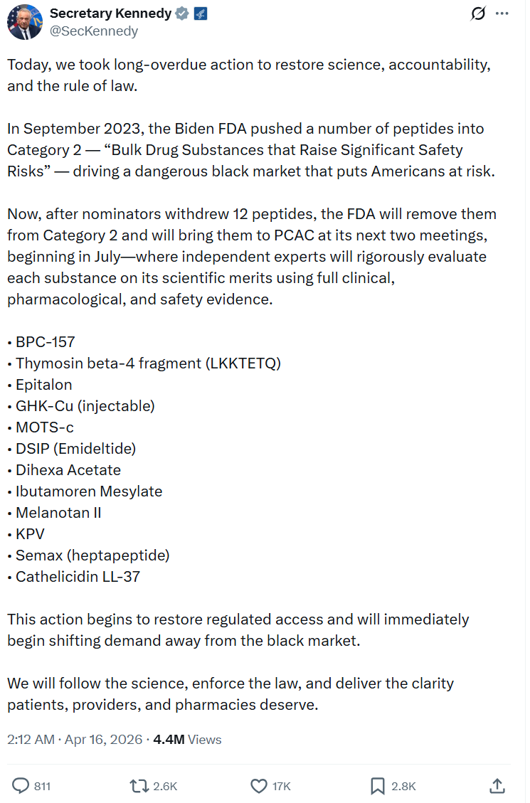 今年年初,在知名播客《Joe Rogan Experience》中,小肯尼迪自称是肽类药物的“忠实使用者”,并公开为尚未获批的注射型肽类产品发声。他透露,FDA正考虑调整十多种合成肽的监管分类,这些肽类在2023年因存在潜在安全风险被列入“类别2”,实际上禁止用于复方配制。他认为这一分类决定“缺乏合法性”,并主张予以纠正。