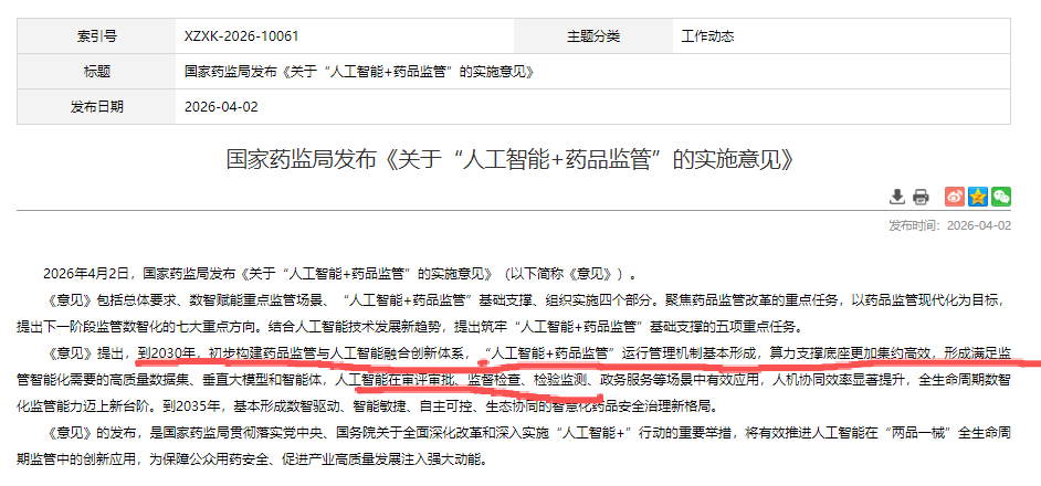可以预见,黄果时代的药监局,将是“AI+药品监管”深度落地的时代。2026年4月初,国家药监局发布《关于“人工智能+药品监管”的实施意见》,明确提出构建人机协同智能审评审批体系,利用AI辅助完成申报资料自动审查、知识检索与报告生成,在保障安全底线的前提下大幅压缩创新药械上市时间。