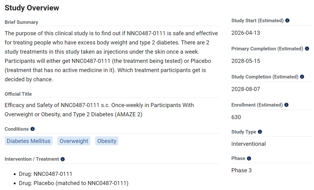 2026年4月16日,诺和诺德在Clinicaltrials.gov网站上注册了Amycretin(NNC0487-0111)治疗二型糖尿病/合并肥胖的三期临床试验AMAZE 2。