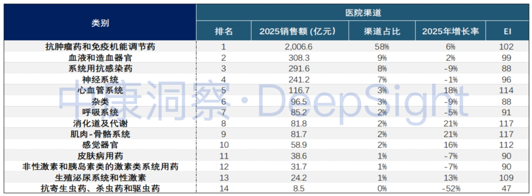 基本盘广阔: 院内不仅是肿瘤与免疫药的主阵地(占比58%),更支撑着血液(9%)、抗感染(8%)、神经(7%)等多学科的重症处方落地。