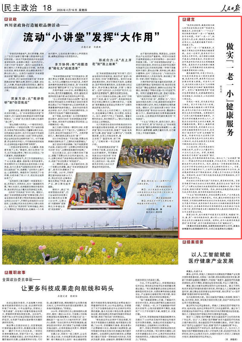 4月16日出版的《人民日报》刊登了全国政协委员、国家传染病医学中心主任、复旦大学附属华山医院感染科主任张文宏教授的署名文章《做实“一老一小”健康服务》。