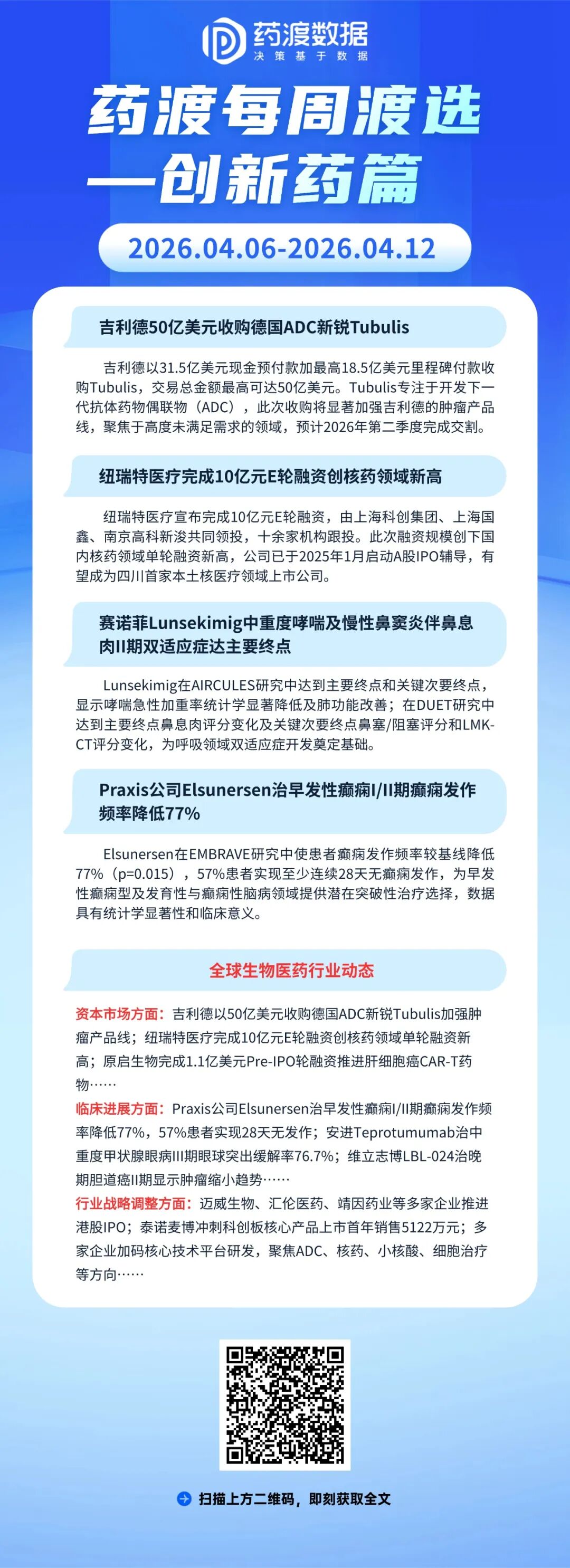 【药渡每周渡选-创新药篇】吉利德50亿美元收购德国ADC新锐;纽瑞特医疗完成10亿元E轮融资创核药领域新高……