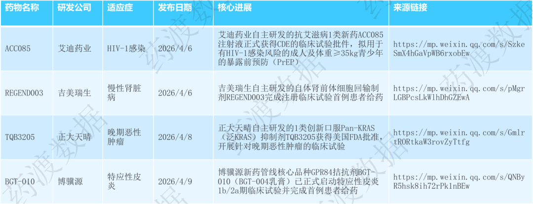 详情:1 类创新药 IND 申请获 CDE 临床试验默示许可,拟用于经标准治疗失败或不耐受的强直性脊柱炎,是国内 iNKT 细胞疗法在自身免疫病领域的重要突破。日期:2026 年 4 月上旬(4 月 6-12 日区间内)详情:小分子药物 IND 申请获 NMPA 批准,用于治疗腓骨肌萎缩症(CMT),是国内首款针对腓骨肌萎缩症的 1 类创新药,计划于 2026 年第一季度开启 I 期临床试验。详情:CDE 官网公示拟纳入突破性治疗品种,适应症为含铂化疗及 PD-(L) 1 抑制剂治疗失败的复发或转移性宫颈癌。该药物有效载荷为拓扑异构酶Ⅰ抑制剂,通过靶向 Nectin-4 在肿瘤组织中的高表达实现精准杀伤,加速其临床研发与上市进程。