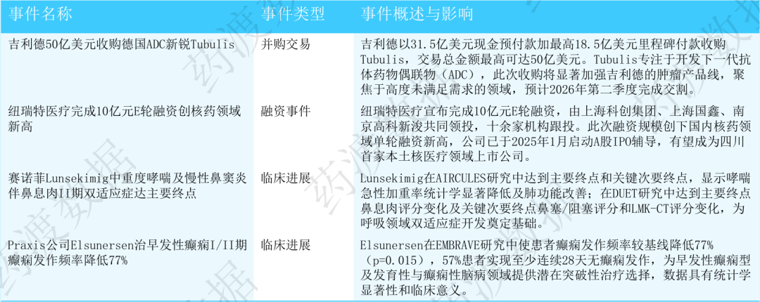 产业合作与融资并购密集落地:吉利德以50亿美元收购德国ADC新锐Tubulis加强肿瘤产品线;纽瑞特医疗完成10亿元E轮融资创核药领域单轮融资新高;原启生物完成1.1亿美元Pre-IPO轮融资推进肝细胞癌CAR-T药物;蔚程医药超额完成5400万美元A轮融资加速肝外递送小核酸疗法;美赛生物完成超1.5亿人民币A轮融资专注巨噬细胞靶点药物开发;迈威生物港股IPO通过聆讯实现A+H布局;天演药业与Incyte合作评估CTLA-4单抗联合TGFβR2/PD-1双抗治疗结直肠癌;甘李药业与JW制药就GLP-1RA双周制剂达成8110万美元独家许可合作;轩竹生物两款自研新药超1亿美元授权出海中东及北非;安斯泰来1500万美元引进AI设计AAV衣壳;康桥资本、合肥国资借道云顶新耀2.5亿美元退出海森生物;武田终止Denali合作归还FTD疗法DNL593并裁员634人;汇伦医药递表港交所。代谢、肿瘤、神经等领域频传佳音:Praxis公司Elsunersen治早发性癫痫I/II期癫痫发作频率降低77%,57%患者实现28天无发作;安进Teprotumumab治中重度甲状腺眼病III期眼球突出缓解率76.7%;赛诺菲Lunsekimig治中重度哮喘及慢性鼻窦炎伴鼻息肉II期双适应症达主要终点;维立志博LBL-024治晚期胆道癌II期显示肿瘤缩小趋势;艾迪药业ACC085获IND批件用于HIV暴露前预防;吉美瑞生REGEND003完成慢性肾脏病注册临床首例给药。药企资本化提速,研发模式持续升级:迈威生物、汇伦医药、靖因药业等多家企业推进港股IPO;泰诺麦博冲刺科创板核心产品上市首年销售5122万元;多家企业加码核心技术平台研发,聚焦ADC、核药、小核酸、细胞治疗等方向;吉利德、武田等MNC通过并购或收缩优化管线布局,标志着平台化授权与战略聚焦已成为行业升级核心驱动力。