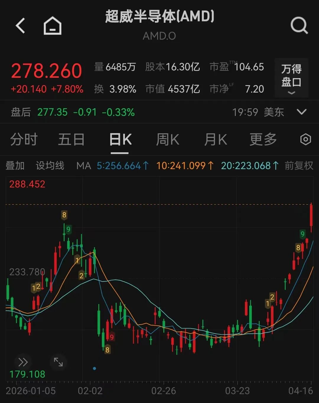 美股4月16日,AI芯片厂商AMD(AMD.O)涨7.8%,收盘278.26美元/股,股价创历史新高,市值达到4537亿美元。