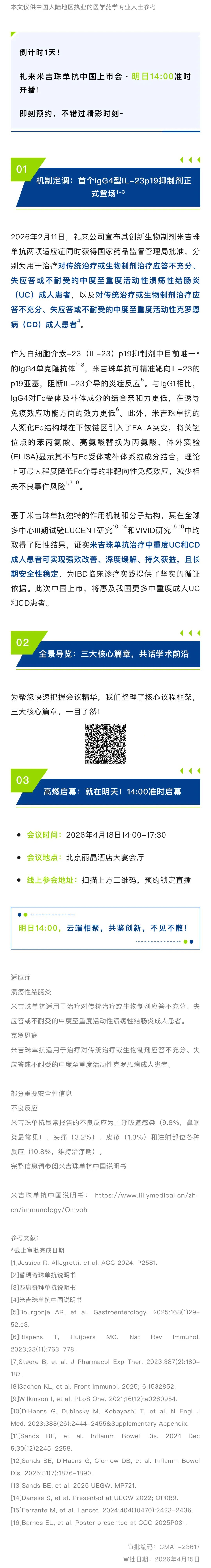 为聚焦IBD长期管理核心难题,共探长效维持新路径,创新靶向药物学术盛典将于2026年4月18日(周六)14:00-17:30,以北京线下会议+线上直播同步开启的形式隆重召开。本次大会国内外消化领域专家将汇聚一堂,共同围绕IL-23 p19靶向机制在IBD治疗中的临床价值、应用前景及以患者为中心的长期管理策略展开深入交流。