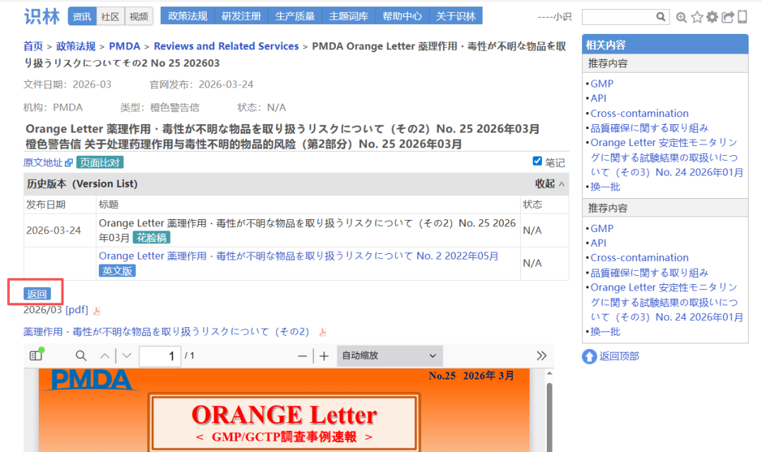 日本药品和医疗器械管理局(PMDA)“橙色警告信”是PMDA分享的GMP检查缺陷典型案例。识林将单份警告信与《品質確保に関する取り組み》页面通过“返回”键关联,从一份案例即可回溯至全部橙色警告信列表、GMP/GCTP年度报告等资源。PMDA发布的GMP/GCTP年度报告详细介绍了其在药品质量管理方面的业务实施与未来展望;另外,页面列出的GMP橙色警告信索引涵盖稳定性试验结果处理、无菌性保证缺陷等具体问题案例,为行业提供了实用参考。