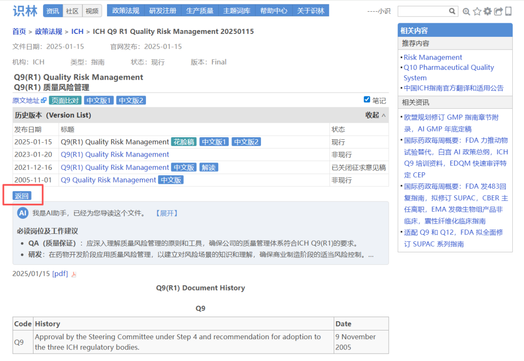场景3:从ICH Q9【返回】查阅历史版本,中文版以及最新培训资料包