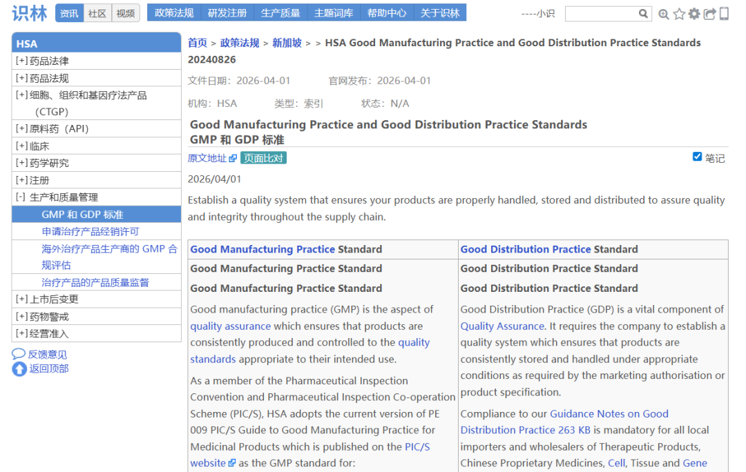 新加坡卫生科学局(HSA)作为PIC/S正式成员,其GMP标准、GDP要求、历年缺陷趋势及配套指南是企业现场检查准备的参考依据之一。当用户找到《2025年生产商GMP缺陷趋势》(例如从识林发布的专题文章《新加坡HSA总结2025年药品GMP检查缺陷》找到),此时点击“返回”即可抵达HSA的“GMP和GDP标准”总览页面,回溯至HSA全部资源库,涵盖GMP(PIC/S PE 009-17及附录)、GDP、历年GMP/GDP缺陷趋势分析(2023-2025)、场地主文件编制指南、基于健康暴露限值的交叉污染控制指南等关键文件。