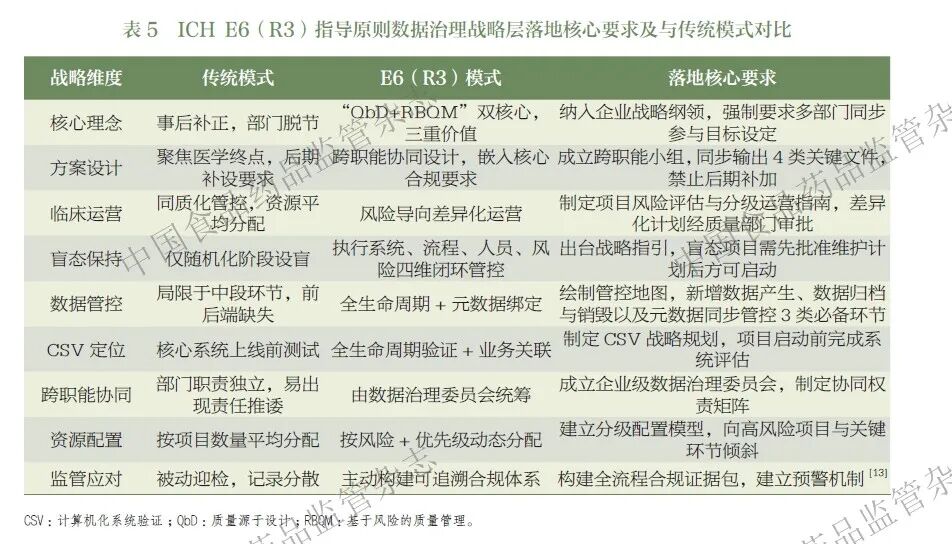 ICH E6(R3) 指导原则的数据治理以“全流程主动控质”为核心,覆盖临床试验全流程(方案设计、执行、数据管控、系统支撑等)及相关部门(临床运营、数据管理、盲态保持、IT、质量、医学等),将盲态保持、数据全生命周期管理、CSV 三大核心模块融入各环节,与传统模式形成了系统性差异(表6)。