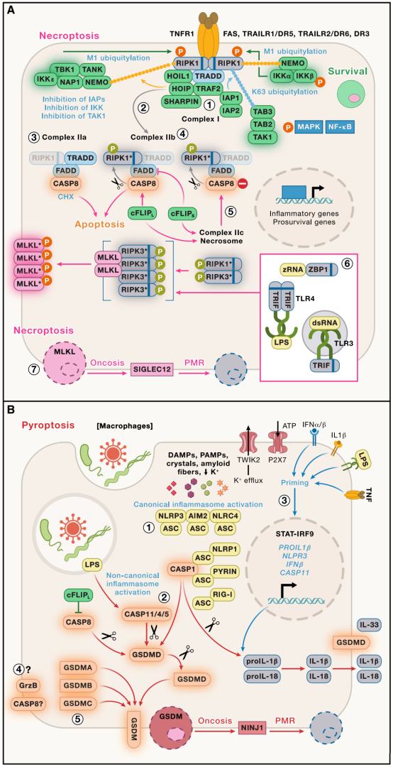 坏死性凋亡和焦亡是两种裂解性、炎症性的细胞死亡方式。与凋亡不同,这两种方式会释放细胞因子和损伤相关分子模式,影响肿瘤抗原的可用性、树突状细胞的活化,从而影响免疫检查点阻断治疗的效果。