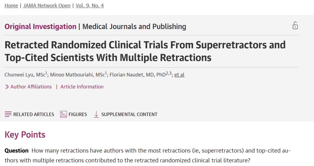如果有人告诉你,全世界每4篇被撤稿的随机对照试验(RCT)中,就有1篇与不到20个人有关,你大概会觉得这是耸人听闻。2026年4月15日,JAMA Network Open发表一项系统性研究,首次用数据为这一灰色地带画了张清晰的肖像:那些撤稿数量惊人、却长期逍遥于学术体系内的“超级撤稿者”(Superretractors),到底是谁,有多少人,造成了多大破坏。结论令人震惊:在全球1330篇被撤稿的RCT中,仅仅6个人就“贡献”了290篇,占总数的22%。他们集中在2个临床专科,有5人来自日本,涉假文章平均在文献中流通14年才被撤回,持续污染着系统综述、临床指南和真实患者的治疗决策。用该研究配套评论的话来说,这些人是证据生态系统中的“超级传播者”。这项研究由意大利帕多瓦大学、法国雷恩大学以及美国斯坦福大学的学者联合完成。合著者中包括斯坦福大学教授约翰·约安尼迪斯(John P.A. Ioannidis)——他是全球最知名的“学术泡沫刺穿者”之一,其代表作《为什么大多数已发表的研究发现都是错的》曾引发学界地震。研究团队以VITALITY队列为基础,这是一个收录了截至2024年11月全球1330篇被撤稿RCT的公开数据库。团队将其与“撤稿观察”(Retraction Watch)推出的“论文撤稿排行榜”前30名、职业生涯引用量居全球前列且累计撤稿超10篇的163名高被引学者名单,以及2024年度被引用量靠前的174名学者名单,进行交叉比对。在“论文撤稿排行榜”前30人中,6人累计共著290篇RCT被撤稿,占全部1330篇撤稿总数的22%。而在163位高被引学者中,18人共著327篇撤稿RCT,占总数的25%。据该研究披露,6位“超级撤稿者”均集中在两个临床专科:4人来自麻醉学科,2人来自内分泌代谢专业。按国籍划分,日本包揽5席,剩余1名是德国学者。其中,日本麻醉科医生藤井善隆(Yoshitaka Fujii)总撤稿172篇,RCT占比70%。他的数据曾被同行质疑“完美”到不切实际,2012年被查实大规模造假。德国麻醉学者阿希姆·博尔特(Joachim Boldt)总撤稿221篇,RCT占比54%,以总撤稿数居所有“超级撤稿者”之首。日本麻醉学者齐藤裕司(Yuhji Saitoh)虽然总撤稿数较少(56篇),但其中RCT占比高达79%,是所有人中最高的。从时间维度看,这些“超级撤稿者”的被撤RCT从发表到撤回,时间中位数为5111天,约14年。在这14年里,假论文以正常学术文献的身份流通于世,被引用,被纳入系统综述,留存在整体证据链中。表:知名“造假之王”们撰写的被撤稿RCT概况。/表源:JAMA Network Open