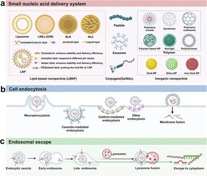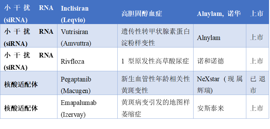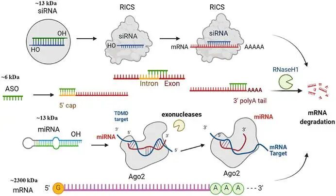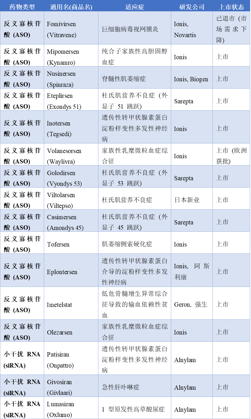 核酸药物在分子层面主要由十到五十个核苷酸通过磷酸二酯键连接而成,涵盖了核糖核酸、脱氧核糖核酸及其各类化学修饰衍生物。作为继小分子药物和抗体药物之后的第三大类药物,小核酸药物的核心优势在于遵循碱基互补配对原则,能够直接靶向疾病相关基因的信使核糖核酸或非编码核糖核酸。这种从基因源头进行调控的机制,成功破解了传统药物难以成药的靶点困境,展现出靶点特异性强、药效持续时间久、耐药风险低等显著特点。纵观全球核酸药物的发展轨迹,其技术演进呈现出清晰的代际更迭规律。核酸药物1.0时代(1990-2010年代),反义寡核苷酸技术确立了以阻断为核心的治疗策略。这类单链分子通过碱基互补配对结合靶标信使核糖核酸,进而阻断致病蛋白的翻译过程。随着化学修饰技术的日益成熟,反义寡核苷酸真正具备了成药属性。2016年诺西那生钠注射液获批治疗脊髓性肌萎缩症,该药物通过调节特定基因的剪接过程,显著改善了患儿的运动功能,成为反义寡核苷酸领域的划时代事件。2.0时代(2010年代至今)以“沉默”为核心,RNA干扰机制在细胞质中特异性降解靶标mRNA。小干扰核糖核酸进入细胞后与核糖核酸诱导沉默复合体结合,在细胞质中实现对靶标信使核糖核酸的特异性降解。2018年全球首款小干扰核糖核酸药物帕蒂斯兰获批用于治疗遗传性转甲状腺素蛋白淀粉样变性。随后靶向特定胆固醇调节蛋白的英克司兰于2021年获批,凭借每年仅需两次皮下注射即可持续降低低密度脂蛋白胆固醇的卓越表现,验证了小干扰核糖核酸高效的基因沉默能力。3.0时代(2020年代至今)以“表达”为核心,将编码蛋白的mRNA递送入细胞,利用人体自身核糖体实现治疗性蛋白的瞬时表达。这一阶段的代表性技术是将编码治疗性蛋白的信使核糖核酸递送入人体细胞,利用人体自身的核糖体实现治疗性蛋白的瞬时表达。二零二零年信使核糖核酸新冠疫苗的迅速问世与大规模应用,不仅验证了这一技术的颠覆性潜力,更向全球展示了核酸药物在应对突发公共卫生事件时的巨大价值。。图2.RNA治疗。包括siRNA、反义寡核苷酸(ASO)和microRNA(miRNA)二、多维视角下的作用机制与药物分类