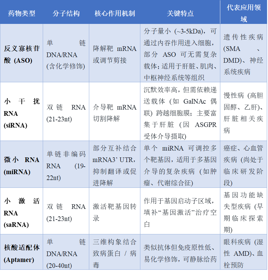 在现代医学漫长的发展历程中,人类对抗疾病的手段经历了从宏观到微观的深刻演变。传统的小分子药物和抗体药物主要致力于干预或阻断已经合成的蛋白质功能,这种方式在面对由基因异常引发的疾病时往往显得力不从心。随着生命科学的探索步入基因组与转录组时代,一种以脱氧核糖核酸或核糖核酸为药物主体的全新治疗模式应运而生。这类药物不再局限于对下游蛋白的物理干预,而是将治疗触角前移至生命信息的转录和翻译环节,通过对信使核糖核酸命运的精准干预,实现对蛋白表达的调控。这种从被动补充蛋白到主动调控生命的理念转变,标志着人类在疾病治疗领域取得了里程碑式的突破。图1. 不同类型小核酸的作用机制一、核酸药物的基本概况与代际演进