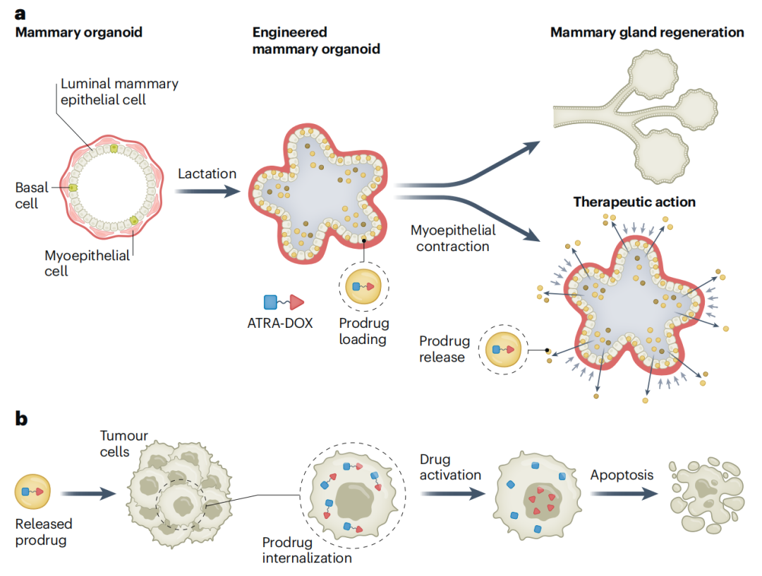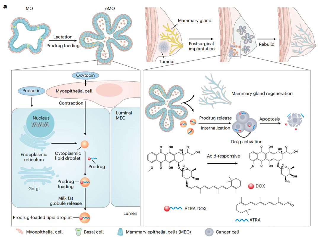 当载有 ATRA-DOX 前药的工程化乳腺类器官被植入手术切除肿瘤后的组织空腔时,一场精密的协同治疗与再生程序便启动了: