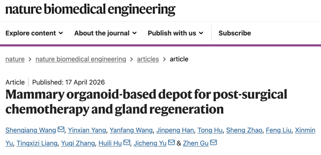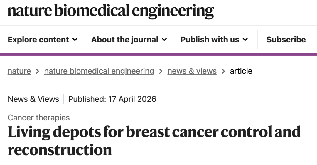 值得一提的是,Nature Biomedical Engineering 期刊同期发表了题为:Living depots for breast cancer control and reconstruction 的评论文章,文章指出,顾臻团队开发的哺乳期诱导的乳腺类器官可作为自调控的活体药物库,在小鼠体内释放酸性激活的化疗药物,以抑制乳腺癌术后的肿瘤复发,同时促进乳腺组织再生。