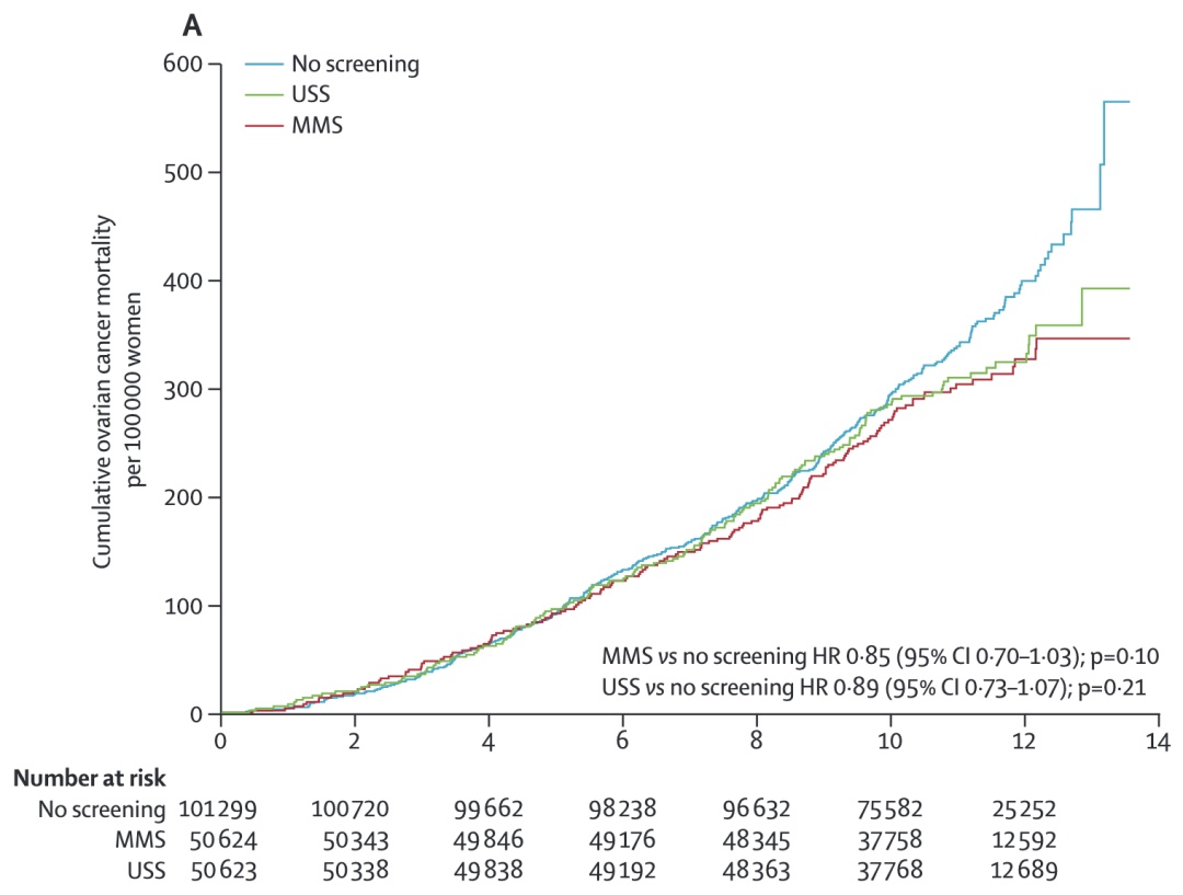 2016年发表在《柳叶刀》(The Lancet)上的UKCTOCS研究则纳入了超20万名女性,而这项更大规模的RCT也表明,不论是单独阴道超声筛查、还是阴道超声结合CA125筛查,都没有显著降低卵巢癌死亡率。[9]