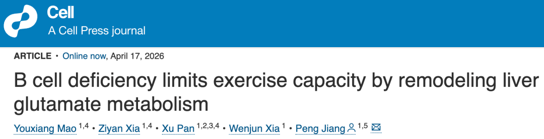 [1].Mao Y, Xia Z, Pan X, Xia W, Jiang P. B cell deficiency limits exercise capacity by remodeling liver glutamate metabolism. Cell. Published online April 17, 2026. doi:10.1016/j.cell.2026.03.039