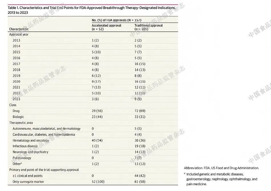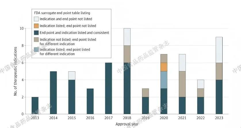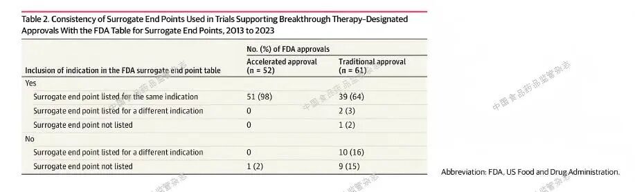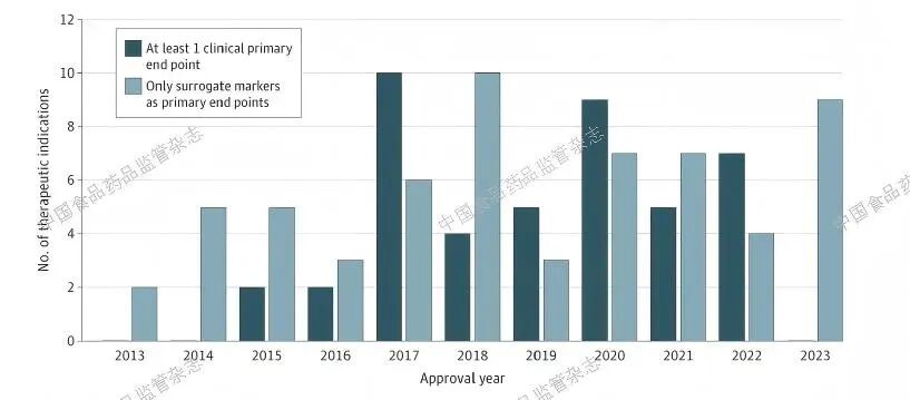 Mooghali 及其同事评估了自2012 年突破性药品认定计划启动以来至2023 年12 月31 日之间所有FDA 通过突破性治疗药品认定通道批准的关键临床试验中所采用的主要终点。还调查了FDA 是否要求或请求进行额外的上市后研究,以确认根据替代指标获批药品的临床疗效。