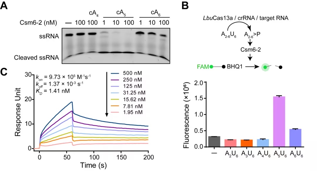 研究团队通过系统的生化分析发现,来自Actinomyces procapsae的Csm6-2蛋白对cA5表现出强烈的响应(图1)。尽管cA6也能激活Csm6-2的RNase活性,但两者激活效率相差悬殊。令人意外的是,表面等离子体共振(SPR)实验显示,cA5与cA6与Csm6-2的亲和力相当,这提示二者结合能力的差异并非激活效率悬殊的原因,Csm6-2对cA5的偏好可能源于更为精细的构象调控机制。