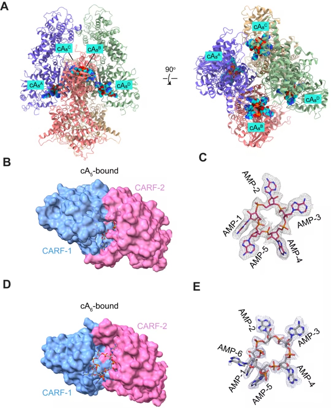 当系统检测到病毒RNA时,Palm结构域会利用ATP合成环状寡腺苷酸(cOA)第二信使,进而激活下游效应蛋白,引发全面的抗病毒免疫应答。尽管cOA信号分子包含从三聚体到六聚体(cA3-cA6)的多种形式,但此前仅鉴定出cA3、cA4和cA6的特异性效应蛋白,而针对cA5这一在噬菌体感染后在宿主细胞内丰度最高的cOA信号分子之一3,其特异性效应蛋白却始终未被发现和鉴定。