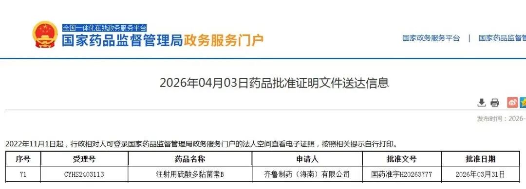 齐鲁制药注射用硫酸多黏菌素B(泰治宁®)获批上市,耐药菌治疗再添新选择