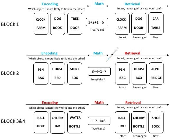 ). Each of the subjects performed two experimental sessions (drug and placebo), each of which consisted of four blocks of associative recognition memory tasks.