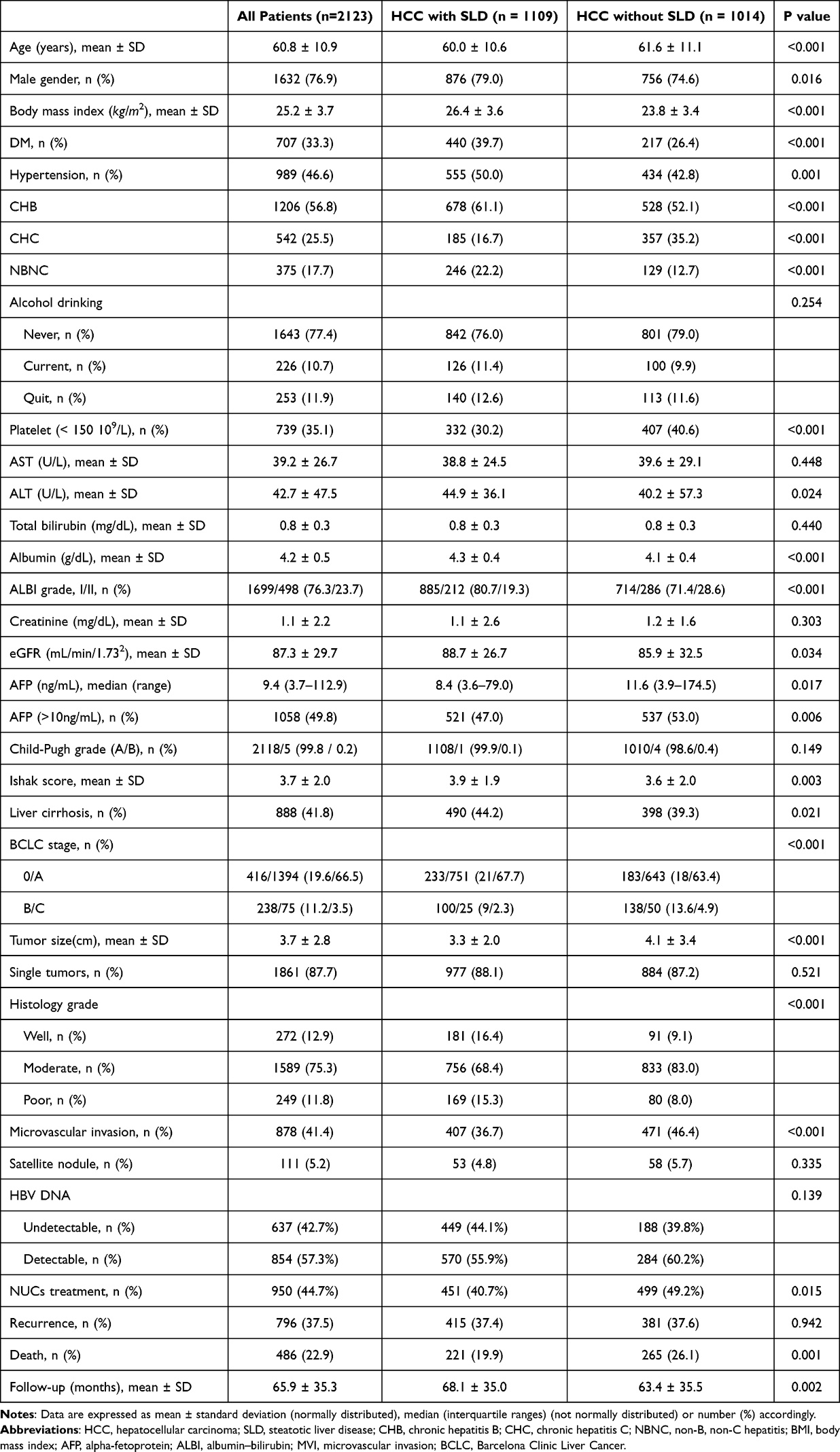 本研究是一项大型回顾性队列研究,共纳入接受根治性肝切除术(R0)的2123例肝癌患者。根据是否存在组织学定义的肝脂肪变性(定义为切除肝标本非肿瘤部分中≥5%的肝细胞发生脂肪变性),将患者分为合并脂肪肝组与无脂肪肝组。
