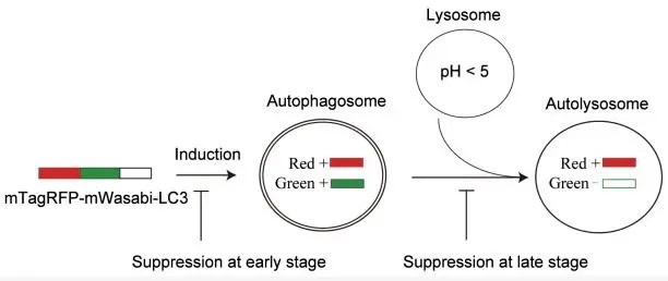 采用同时携带mRFP与GFP的病毒载体感染细胞,可构建双荧光自噬指示体系。GFP为酸敏感性荧光蛋白,在酸性环境中荧光会淬灭,而mRFP则较为稳定,不受pH变化影响。