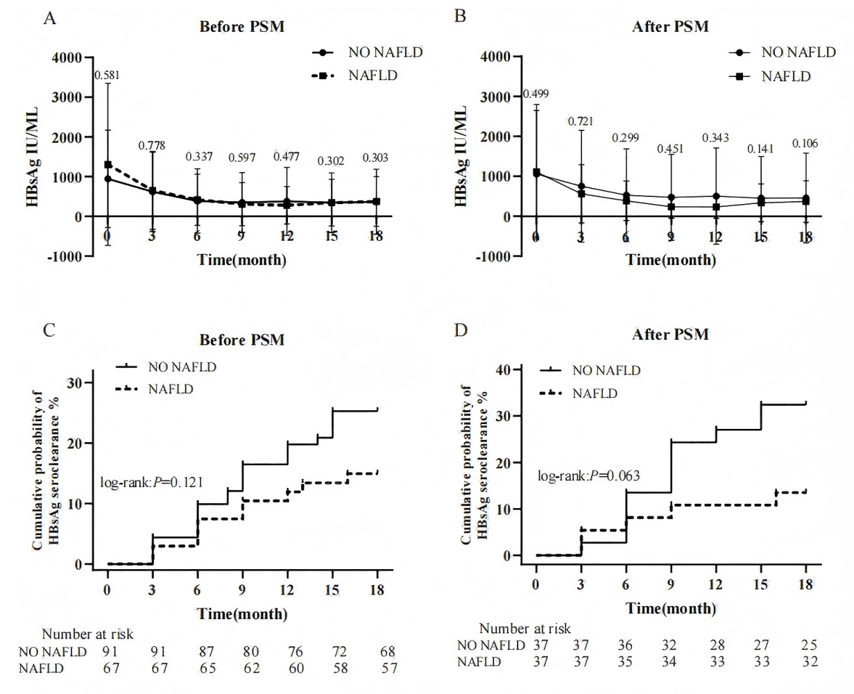 根据基线HBeAg状态和NAFLD将患者分为4个亚组,非NAFLD+HBeAg阴性组、非NAFLD+HBeAg阳性组、NAFLD+HBeAg阴性组、NAFLD+HBeAg阳性组。4组在PSM前(32.8% vs. 12.1% vs. 17.5% vs. 7.4%, P = 0.060)和PSM后(42.9% vs. 18.8% vs. 18.2% vs. 6.7%, P = 0.058)的累积HBsAg清除率均无显著差异。无论HBeAg状态如何,PSM前后NAFLD组与非NAFLD组的累积HBsAg清除率均无显著差异。