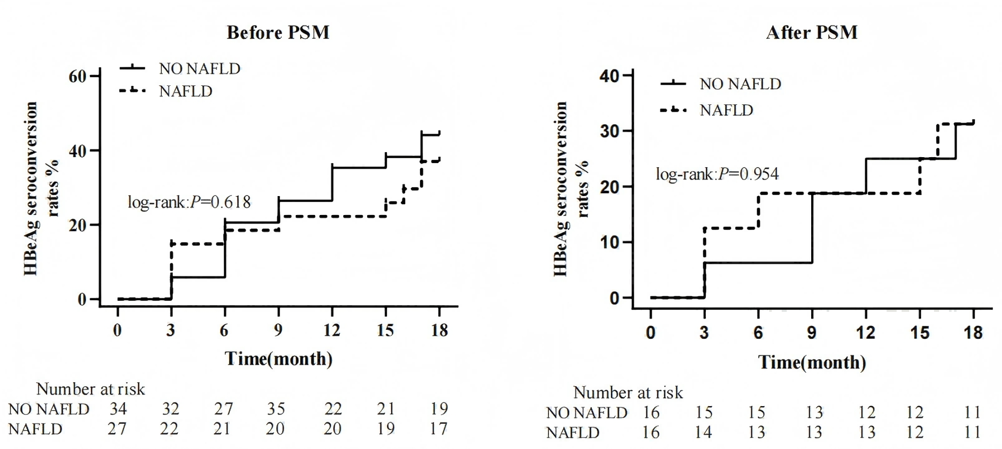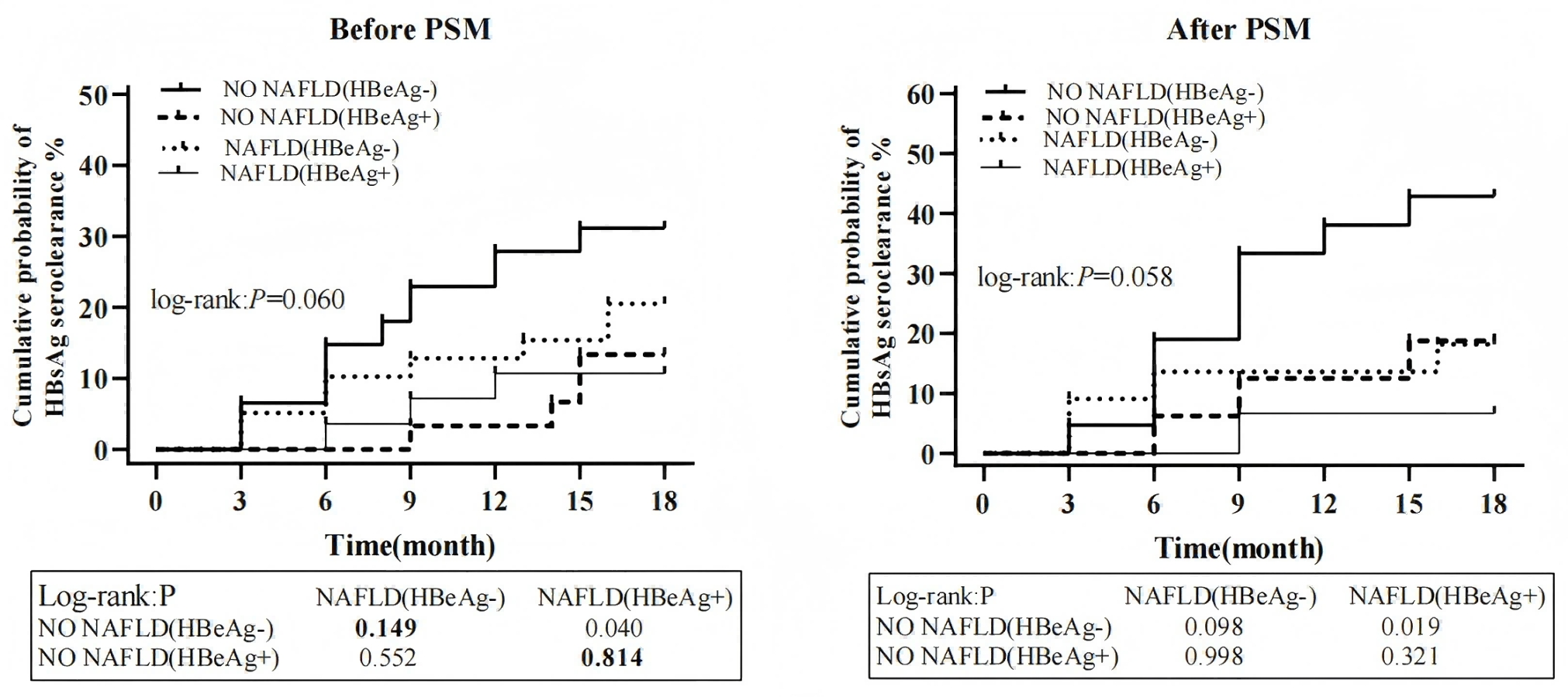 随访结束时,CHB组与CHB-NAFLD组的累积HBeAg血清学转换率无显著差异(P = 0.618)。PSM后,两组的累积HBeAg血清学转换率仍无显著差异(P = 0.954)。